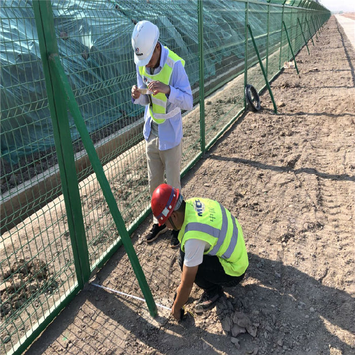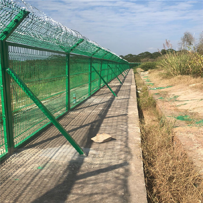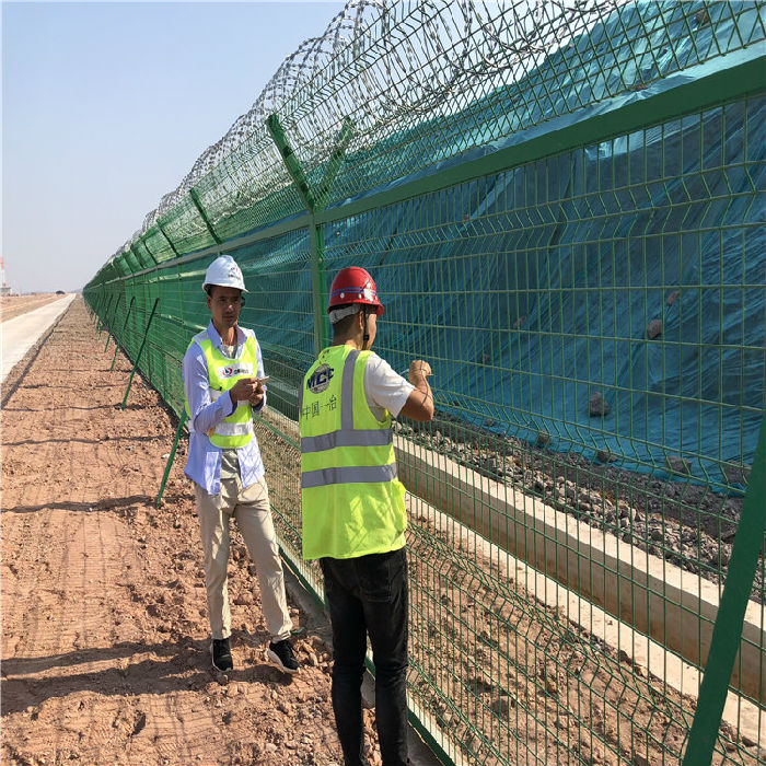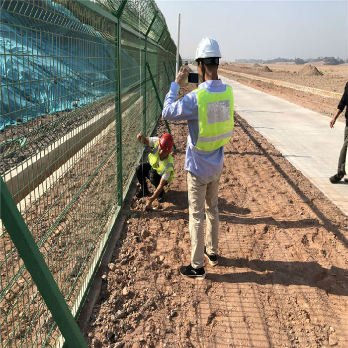 我公司榮幸參與了長沙黃花國際機場機場圍界的供應及安裝,圍界每6米用量鋼筋網片(立柱)6*2.5m,鋼筋網片(斜撐)6*0.45*2m,立柱5.8m,斜撐與延伸臂4.1m,斧形刺刀圈6m,角鋼22m,六角螺絲8個,刺鋼絲6m,C20混泥土地梁0.37m3,C20混泥土基座0.36m3,碎石墊層0.34m3。